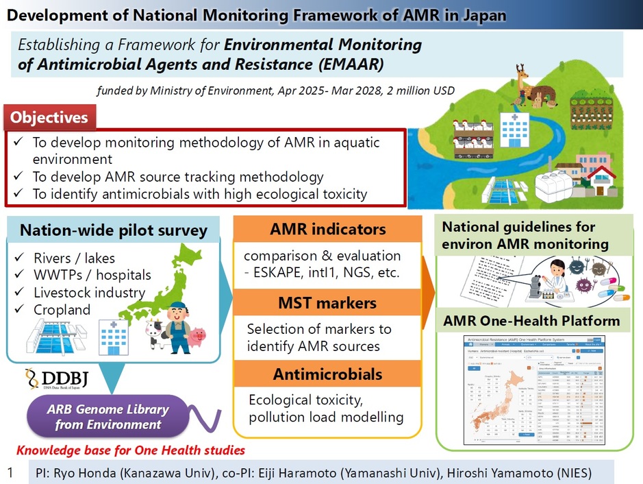 A research project has been launched, led by a team from Kanazawa University, University of Yamanashi, and the National Institute for Environmental Studies, in collaboration with seven universities and research institutes across Japan—The University of Tokyo, Ehime University, Tohoku University, Kyoto University, Kitasato University, Kochi University, and the National Institute of Health Sciences. The research group has begun work on the study titled “Research Toward the Development of a Monitoring Framework for Antimicrobial Resistance and Antimicrobial Agents in the Environment.” This research project was selected as a Strategic Research and Development initiative (SII-12) under the FY2025 Environmental Research and Technology Development Fund of the Environmental Restoration and Conservation Agency of Japan, and officially commenced on April 1, 2025.