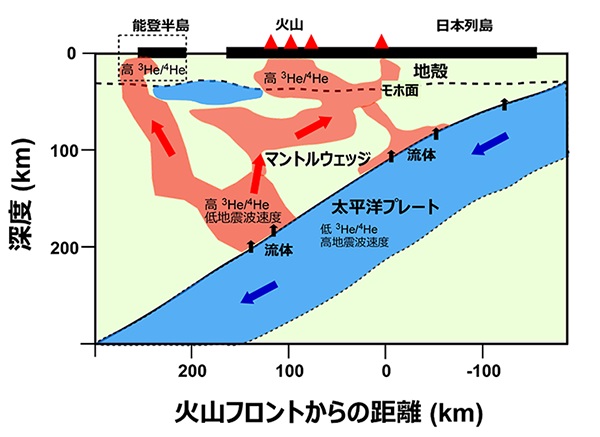 To understand the origin of deep fluids and the phenomena that occurred underground in the northeastern Noto Peninsula following earthquake swarms, we monitored temporal variations in the ³He/⁴He ratio (*1) in hot springs in the area and analyzed the results in combination with seismic wave tomography (*2).