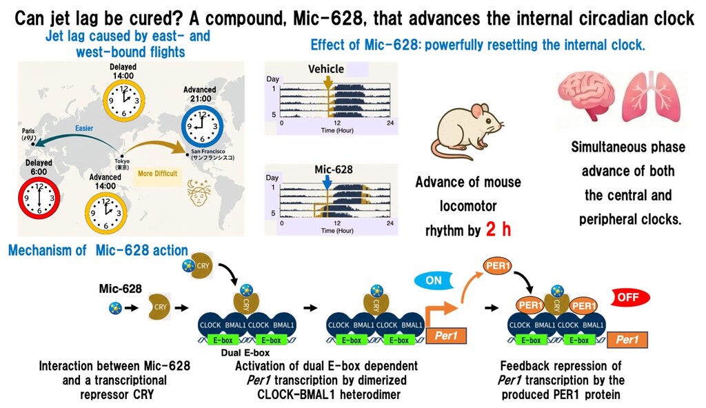 【Key findings】 A collaborative team including Emeritus Professor Tei H. (Kanazawa University), Associate Professor Takahata Y. (Osaka University), Professor Numano R. (Toyohashi University of Technology), and Associate Professor Uriu K. (Institute of Science Tokyo) discovered that Mic-628 selectively induces the mammalian clock gene Per1. Mic-628 works by binding to the repressor protein CRY1, promoting the formation of a CLOCK–BMAL1–CRY1–Mic-628 complex that activates Per1 transcription through a “dual E-box” DNA element. As a result, both the central clock in the brain’s suprachiasmatic nucleus (SCN) and peripheral clocks in tissues such as the lungs were advanced—in tandem and independent of dosing time. In a simulated jet lag mouse model (6-hour light-dark phase advance), a single oral dose of Mic-628 shortened re-entrainment time from seven days to four. Mathematical modeling revealed that the compound’s stable and unidirectional phase-advancing effect is mediated by a negative auto-regulatory feedback of the PER1 protein itself.