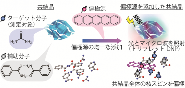 In this study, we developed a cocrystallization technique as a method to dramatically increase the types of molecules to which triplet DNP can be applied. We developed a cocrystal composed of an analyte, coformer, and a polarization source, which is the source of sensitivity enhancement, and realized triplet DNPs of multiple molecules including urea, an MRI molecular probe, at room temperature.