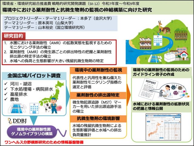 このたび、金沢大学、山梨大学、国立環境研究所の研究チームが中心となり、国内7つの大学・研究機関(東京大学、愛媛大学、東北大学、京都大学、北里大学、高知大学、国立医薬品食品衛生研究所)との共同研究グループが、「環境中における薬剤耐性と抗微生物剤の監視の枠組構築に向けた研究」に取り組むことになりました。この研究は、独立行政法人環境再生保全機構の令和7年度環境研究総合推進費・戦略的研究開発課題(SⅡ-12)に採択され、令和7年4月1日より始動しました。