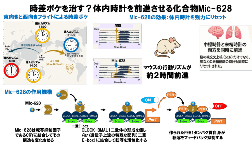 「朝起きるのがつらい」「海外旅行の時差ぼけを早く治したい」—そんな願いを叶える鍵は、私たちの細胞にある『時計遺伝子(※1)』が握っています。金沢大学の程 肇名誉教授(元・旧三菱化学生命科学研究所主任研究員)、大阪大学大学院歯学研究科・ゲノム編集技術開発ユニットの高畑佳史准教授、豊橋技術科学大学次世代半導体・センサ科学研究所の沼野利佳教授、東京科学大学生命理工学院生命理工学系の瓜生耕一郎准教授らを含む共同研究グループは、哺乳類の概日時計遺伝子 Period1Per1)を特異的に誘導する化合物 Mic-628 を新たに発見しました。