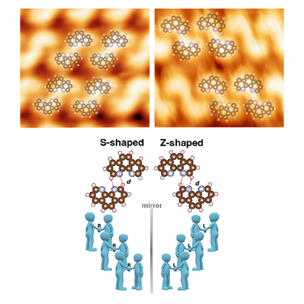 金沢大学理工研究域数物科学系の吉田靖雄准教授と Erlina Tik Man(研究当時:自然科学研究科数物科学専攻博士後期課程)および自然科学研究科数物科学専攻博士後期課程 1 年の兼子裕矢、九州大学カーボンニュートラル・エネルギー国際研究所の中村潤児特任教授、インドネシア国立研究イノベーション庁のサスファン・アルマン・ウェラ教授、九州大学大学院工学研究院応用化学部門の小出太郎助教、北海道大学触媒研究所の武安光太郎准教授らによる国際共同研究グループは、本来は左右対称でキラリティ(※)を持たない分子が、金表面上で非対称なペアを組むことで、キラリティを発現することを発見しました。