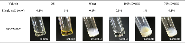 表1:OSおよびDMSOのエラグ酸の溶解性比較(OSはOE₂imC₃C 70%水溶液)