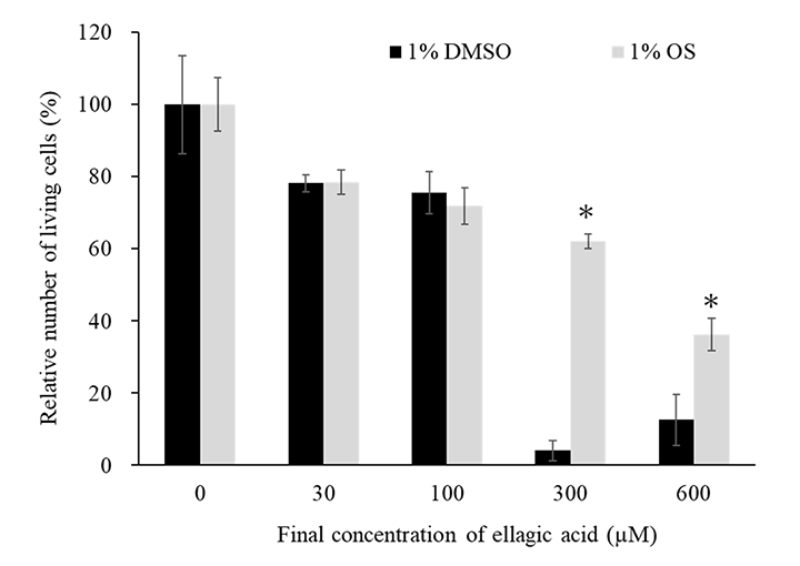 図2:エラグ酸の肝細胞毒性試験における溶媒の影響(OSはOE₂imC₃C 70%水溶液)