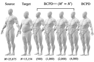 同助教は、非線形点群位置合わせ問題に対し、これまで試みられることのなかったガウス過程回帰と呼ばれる予測手法に基づいた近似計算を行うことで、計算コストを飛躍的に軽減させることに成功しました。1400万点以上で構成される形状の組(図1)に対する位置合わせを行った結果、昨年報告した先行手法では24時間以上であった計算時間を2分程度に短縮することが確認されました。また、人間の3Dモデルやスキャンデータで構成される、いくつかの形状の組に対してこの手法を適用できることが数値実験により示されました(図2)。