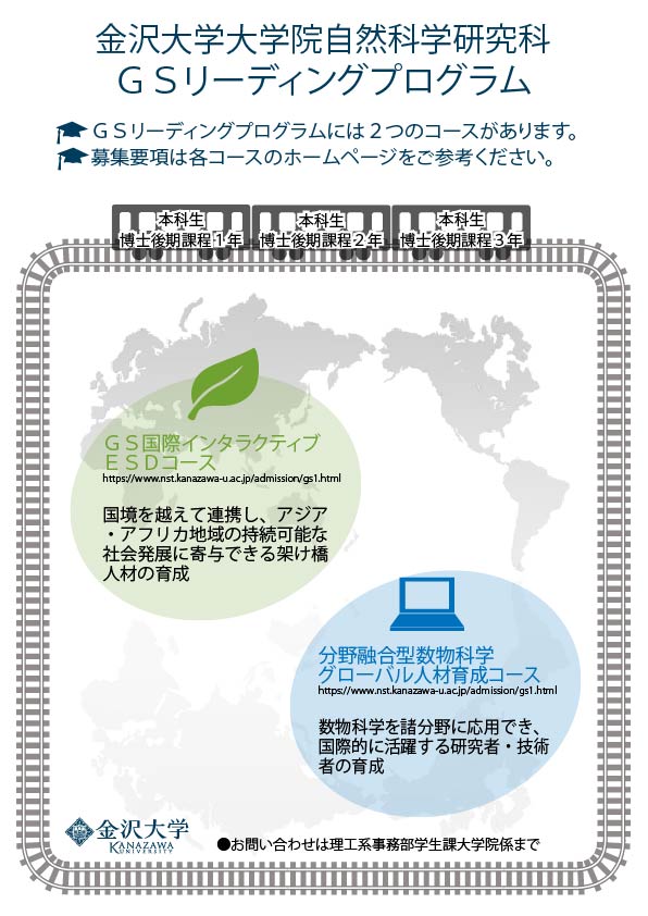 HOME GSリーディングプログラム GSリーディングプログラム [予科]博士前期課程2年[本科]博士後期課程 プログラムTOP 産学連携イノベーション人材養成コース[GS-HRI] 国際インタラクティブESDコース[GS-II-ESD] 分野融合型数物科学グローバル人材育成コース[GS-GHR] 募集要項(本科生) 募集要項(予科生) 各種様式 学生を募集したい企業の方へ GSリーディングプログラム 創造的な視点と粘り強い交渉力,強い統率力と確かな実践力をもって,未来に挑戦する高度専門人材養成 ※クリックで拡大 GSリーディングプログラムの流れ 支援 カリキュラム履修に伴う海外渡航旅費を,本科期間中1回支給(上限額有り)※ ※ 支給金額は年度毎に変更の可能性あります。 問い合わせ先 住所:〒920-1192 石川県金沢市角間町 E-mail:inowaka@adm.kanazawa-u.ac.jp 関連リンク 科学技術振興機構 イノベーション創出若手研究人材養成 博士人材キャリア開発サイト